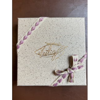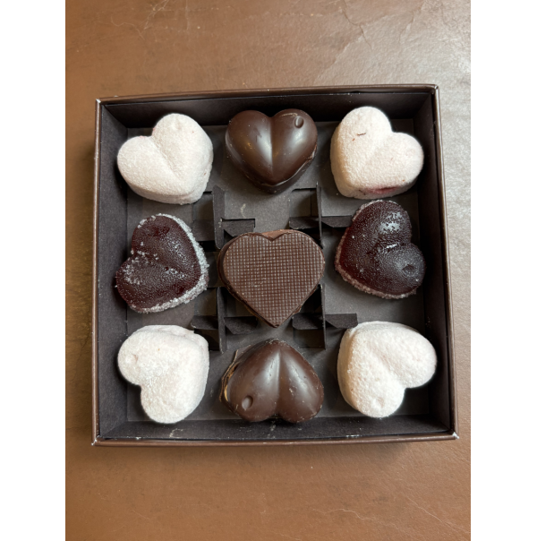 Ingrédients : masse de cacao Cameroun, sucre, beurre de cacao, émulsifiant : lécithine, arôme : vanille naturelle, purée de fruit (selon les pièces: framboise, cerise, fraise, myrtille, poire ou abricot), glucose, pectine, sucre semoule, eau, sucre inverti, gélatine bovine